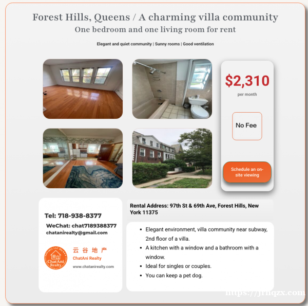 纽约皇后区森林小丘优雅社区别墅_一室一厅出租2310